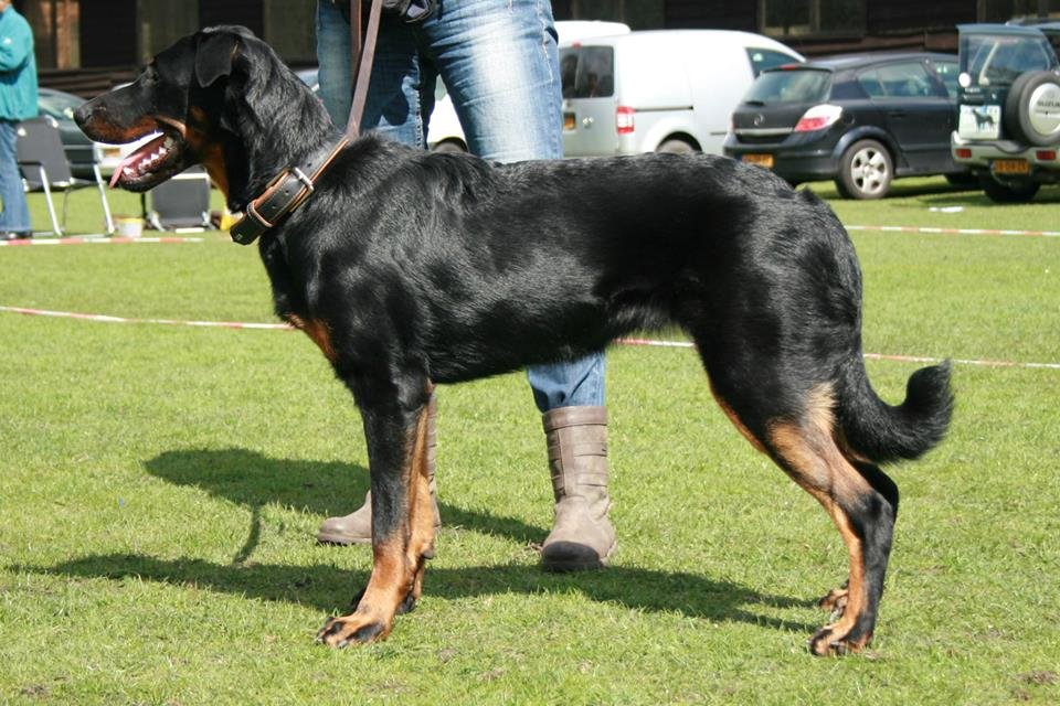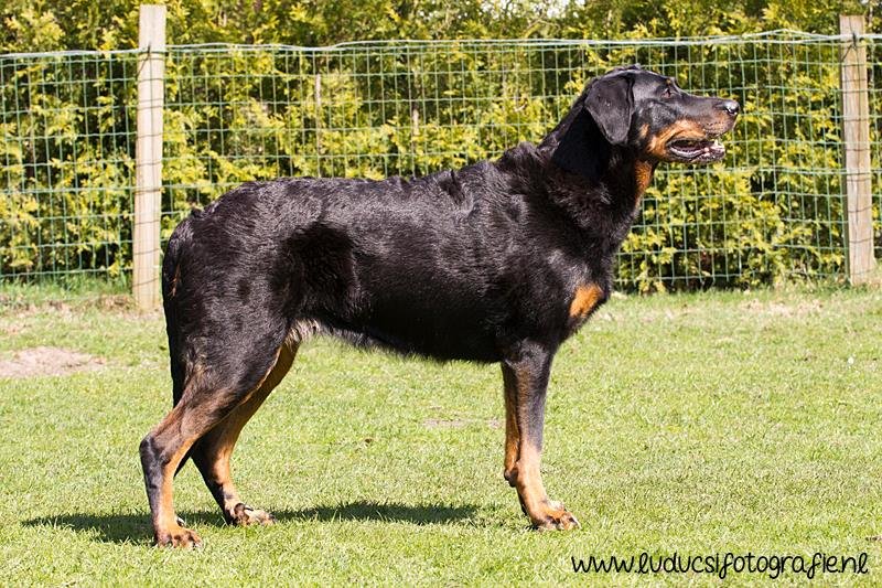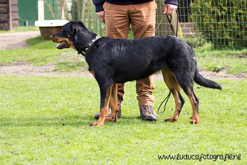Vader: 4 jaar. Flinke, zeer krachtige reu. Stevig gebouwd met flink bone. Wat zwaar hoofd, dat tamelijk diep is.. Mocht meer hals tonen. Mooi glanzende zwarte vacht met mooie brand. Wk in orde. Gaat wat zwaar, mocht meer J tonen in de staart, die hoog gedragen wordt. Prettig gedrag.