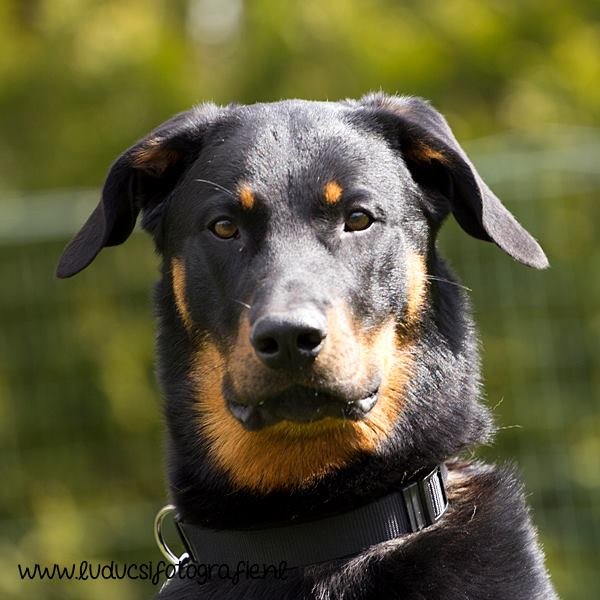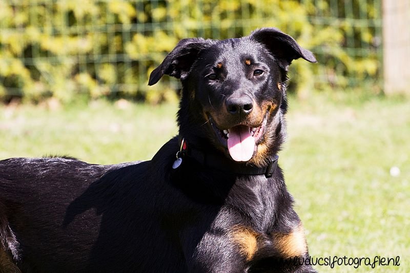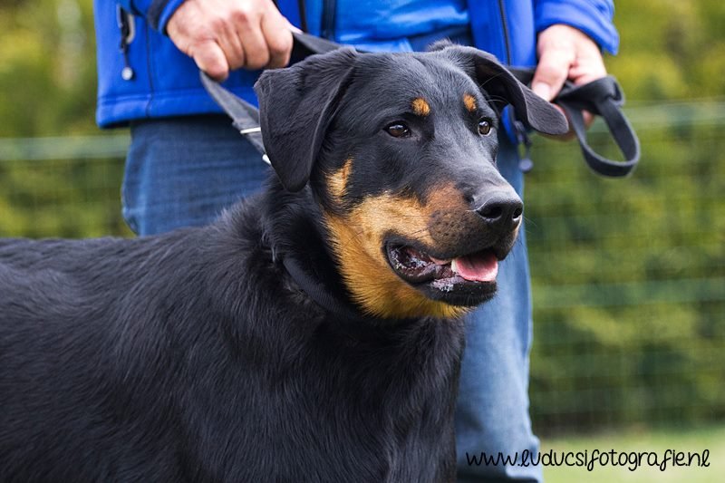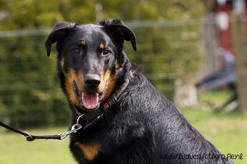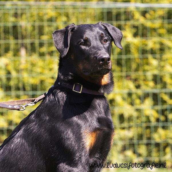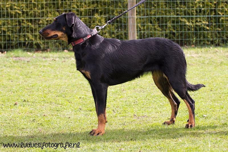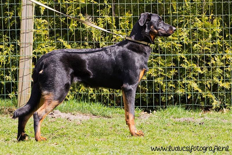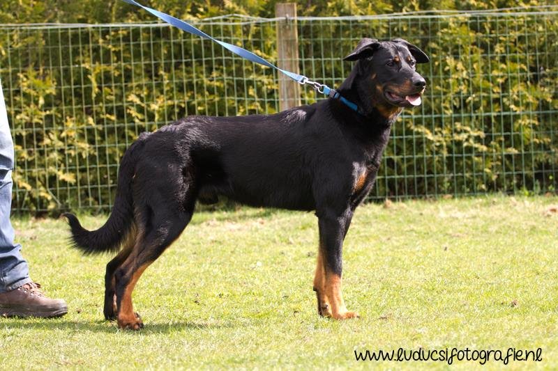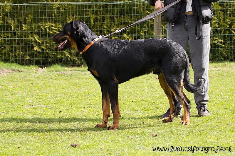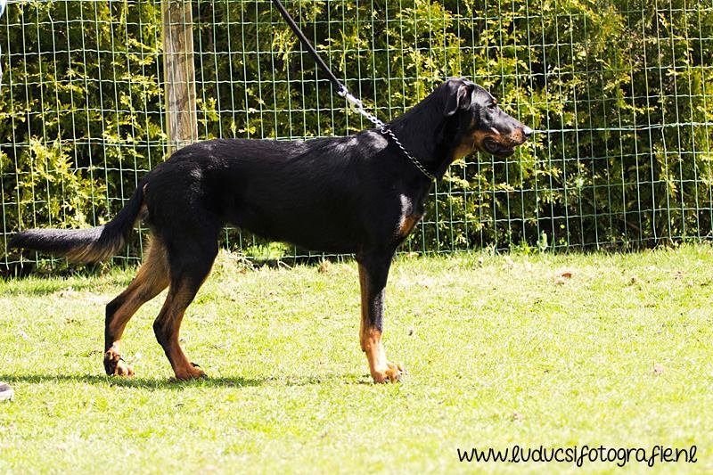 1 jaar oud. Nog jeugdig ogende reu. Mooi rasbeeld. Goed hoofd. Correct gebit. Goed gehoekt voor en achter. Al mooi ontwikkelde borstkas. Mooie nek-ruglijn. Keurige tan tekening. Mist hubertusklauw. Ruim uitgrijpend gangwerk. Mooie staart, met J. Vriendelijk gedrag