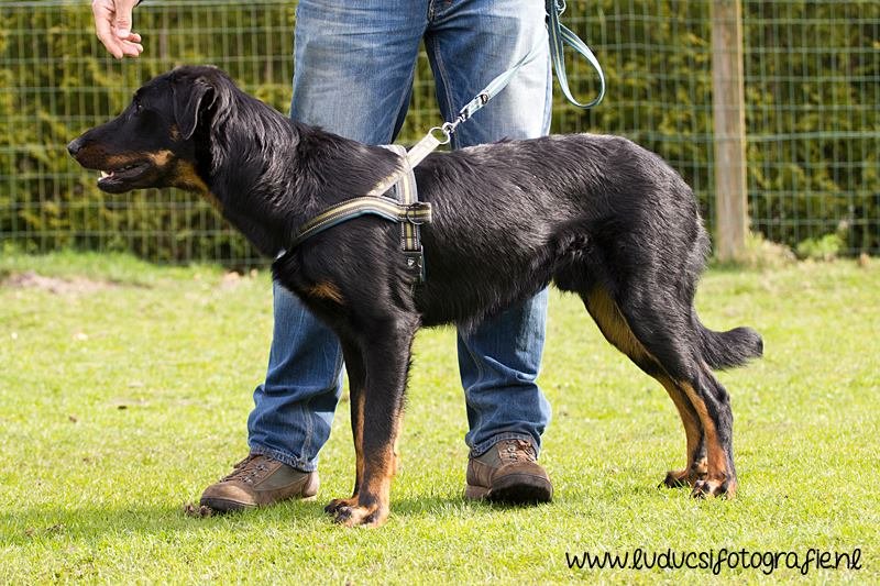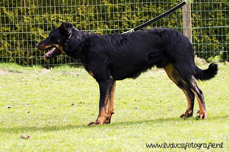 Stevige reu, 1 jaar oud. Goed type. Goed hoofd. Voor en achter goed gehoekt. Mooi ontwikkelde borstkas. Mooie nek-ruglijn. Iets afstaande vacht. Voorvoeten mogen vaster. 1 hubertusklauw. Vlot gangwerk. Plezierig gedrag.