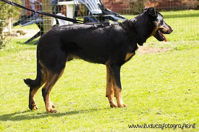 1 jaar oud. Goed type, nog helemaal in ontwikkeling. Goed hoofd. Voldoende gehoekt voor en achter. Voldoende ontwikkelde borstkas. Voorvoeten wat zwak. Mist hubertusklauw. Goede nek-ruglijn. Vlot gangwerk. Iets hoog gedragen staart. Vriendelijk gedrag.