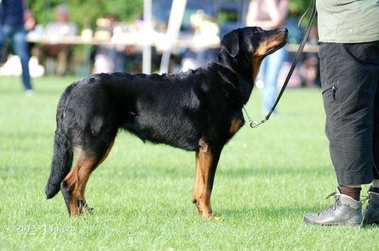 18 mnd. Z.G. geslachtstype. Zwart met correcte tan. Hoofd zou iets gestrekter mogen. Oor wat hoog aangezet. Oog ovaal, voldoende horizontaal. Correcte snuit, toont wat keelhuid. Correcte hals, vaste rug. Schouder iets ver naar voren, verder correcte houding. Goed ontwikkeld lichaam. Goede voeten, benen en bespiering. Prima temperament. Correcte J-staart, iets gekruld gedragen. Zou achter wat meer stuwing mogen hebben & gaat voor los.