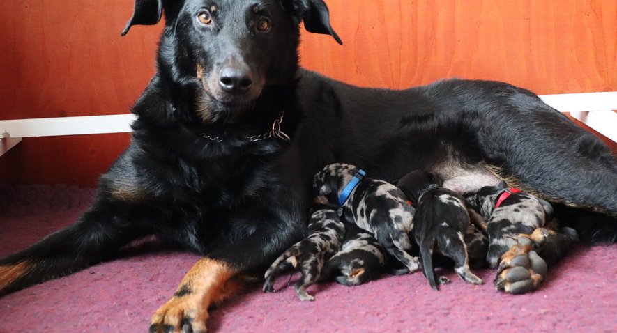 Rizlan is 10 jan weer moeder geworden van 4 reutjes en 2 teefjes , waarvan een teefje black and tan en de rest is harlequin..
