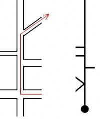 Op de foto is een voorbeeld gegeven van hoe een stripkaartroute eruit zou kunnen zien. U begint op de route op de stip, en in werkelijkheid gaat u het rode lijntje volgen van onder naar boven. U komt eerst bij een kruispunt. Daar moet u twee wegen aan uw linkerkant laten liggen. Op een kruispunt betekent dit dus dat u rechtsaf moet slaan. Daarna moet u eerst een weg rechts laten liggen, en daarna twee wegen links. Bij die tweede weg links betekent dat u zélf rechtsaf moet slaan.