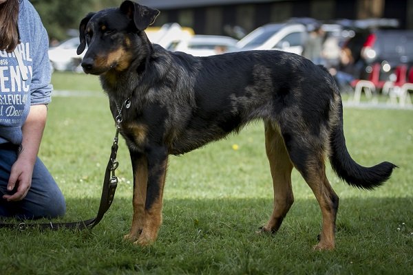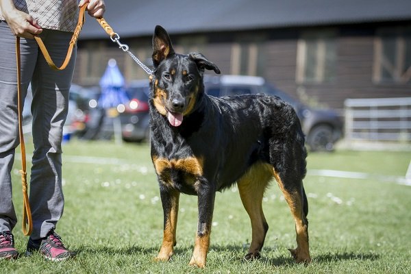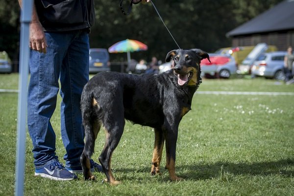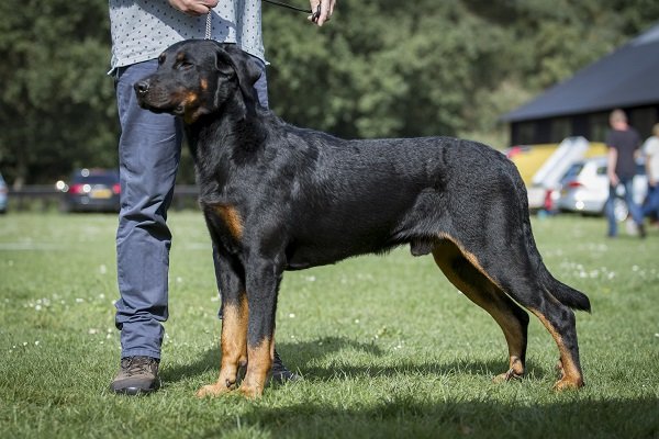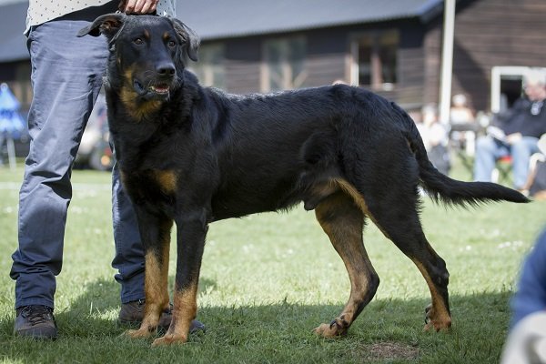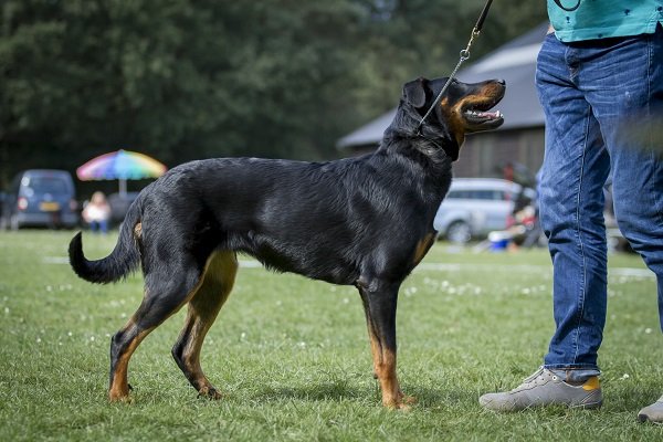 19 maanden. Krachtige reu met prima verhoudingen. Goed gevormd hoofd. Correct gebit. Mooi oog. Hoog en wijd gedragen oren. Voor goed gehoekt, bekken iets sterk hellend. Mooi ontwikkelde borstkast. Vlot uitgrijpend gangwerk. Goede vacht. Brand mag donkerder. Vriendelijk gedrag.