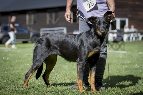 18 maanden. Flinke teef die bijna vierkant oogt. Hoofd met goede verhoudingen. Correct gebit. Oog mag fractie donkerder. Oor wat wijd gedragen. Voor en achter juist voldoende gehoekt. Toont nog zeer licht gebouwd. Gaat vlot met hoge staart. Goede vacht. Warm brand. Voorbeeldig vriendelijk gedrag.
