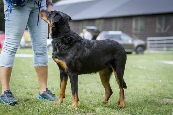 2 jaar. Krachtig gebouwde teef. Goede verhoudingen, goed type. Goed gevormd hoofd. Tanggebit. Mooi oog. Wijd en hoog gedragen oren. Goede hoekingen. Prima bovenbelijning. Vlot en vrij gangwerk. Prima vacht in kleur en structuur. Niet geheel vrij in gedrag. Niet onvriendelijk.