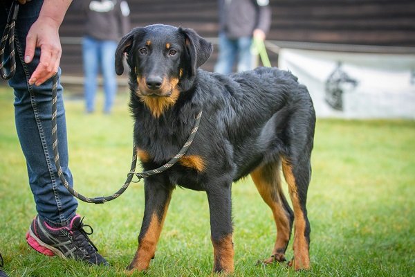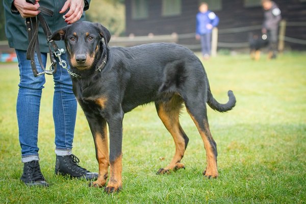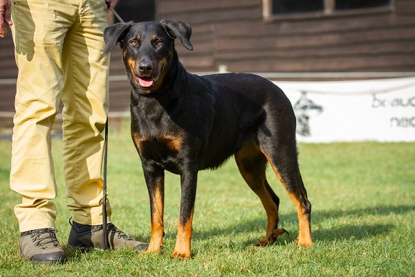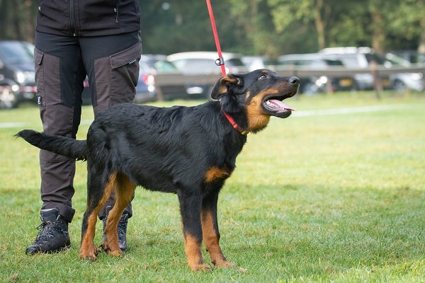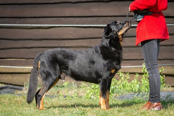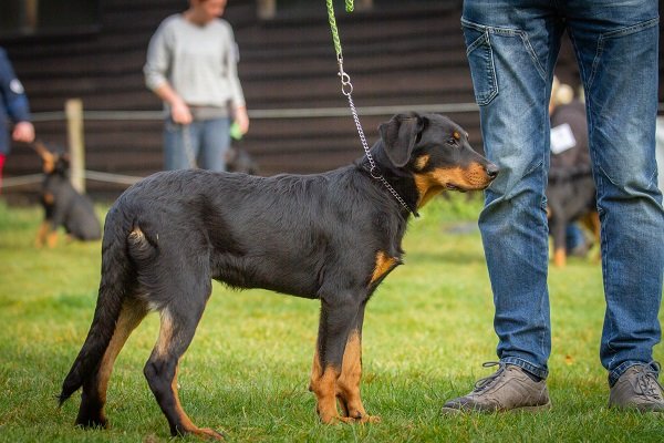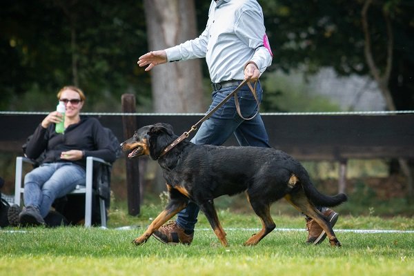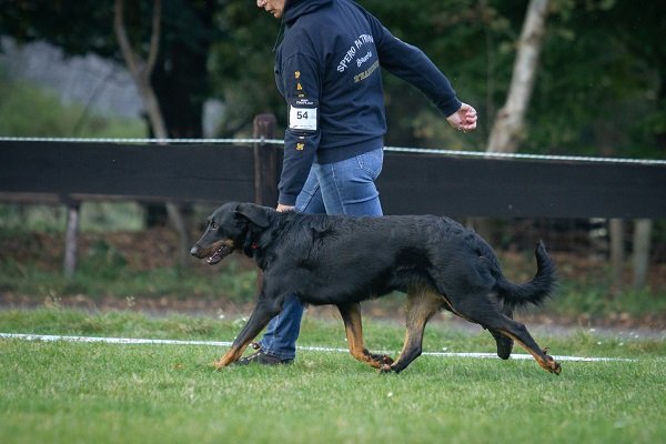 8 maand, flinke teef. Lichaam moet nog ontwikkelen. Goed gevormd hoofd, donker oog, compleet schaargebit met krachtige elementen. Goede toplijn. Passend bone. Goede voorborst en hoekingen. Goede vacht en kleur, warme brand. Loopt vlot en soepel, staart wat hoog gedragen. Vriendelijk gedrag.