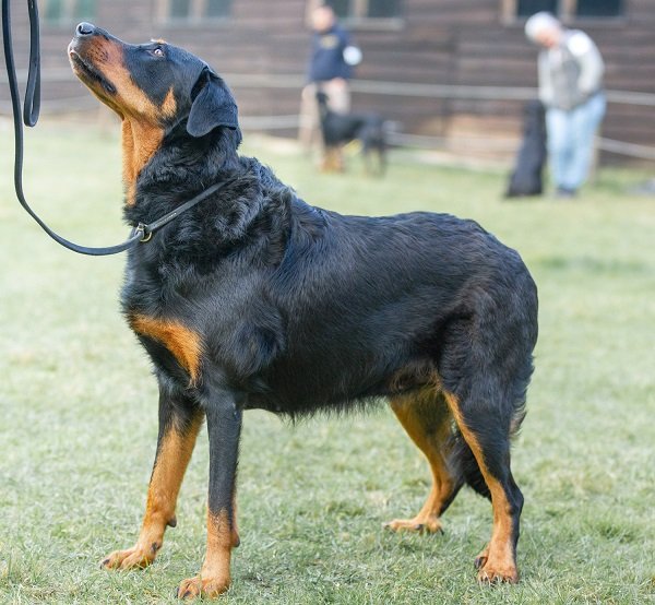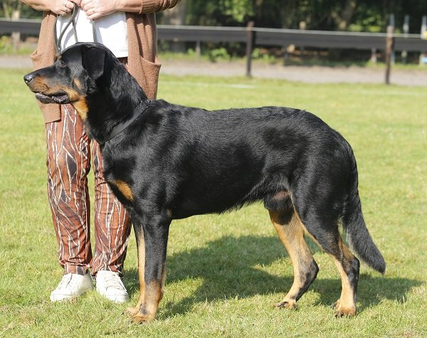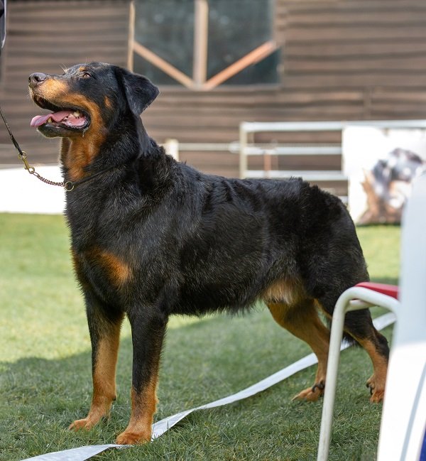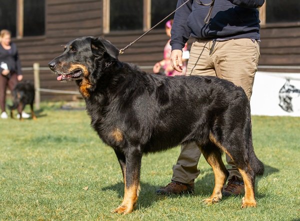 Stevig gebouwde teef, wel vrouwelijk. Mooi type. Mooi parallel hoofd, mooi oog, correct gebit. Voldoende hals, wat zwaar in lichaam, vooral de onderbelijning. Goede hoekingen, iets golvende vacht. Mooie warme brand. Toont bij het gaan haar zware conditie. Prima, fijn stabiel gedrag.