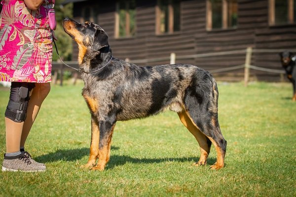 6 maand. Goed ontwikkelde reu. Goed gevormd hoofd, mooi oog, correct oor, correct gebit. Goede hals. Evenredig gehoekt, passend bone. Goede kwaliteit vacht arlequin mocht helderder. Diep warme brand. Kan draven maar liep in telgang. Lange start met af en toe een ‘J.