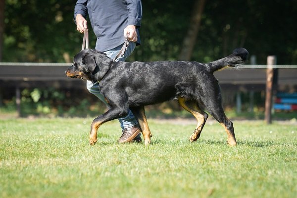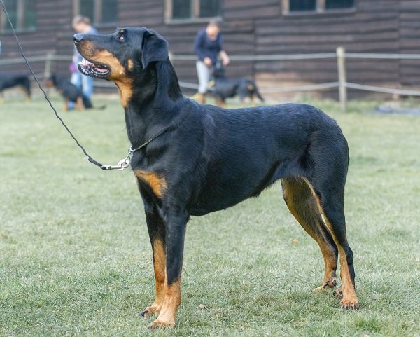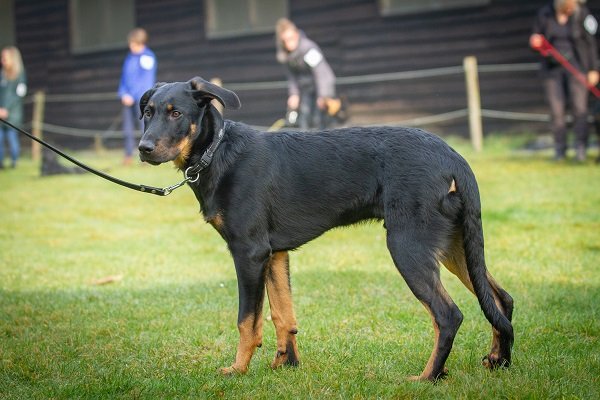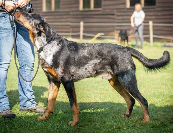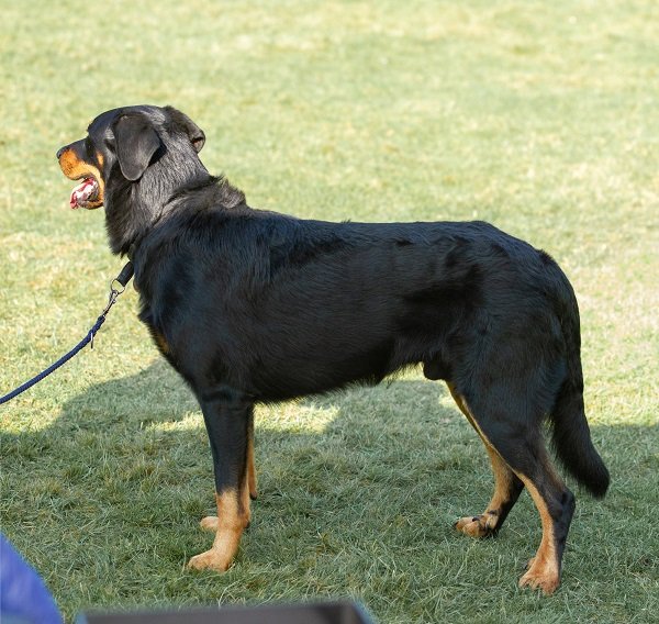 17 maand. Forse reu, maximum maat. Gestrekte bouw. Krachtig, mannelijk hoofd, diepe stop, veel lip. Donker oog, correct gebit. Rechte rug, passend bone. Harmonisch gehoekt. Lange staart, af en toe ‘J’. Kon wat ruimer gaan. Kalm gedrag.