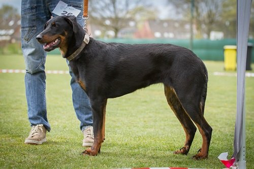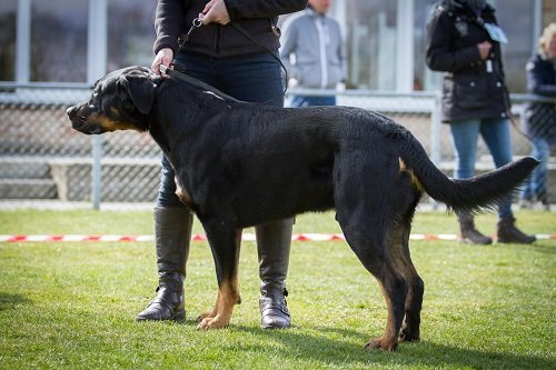 14 maanden. Grote reu. Uitmuntend geslachtstype. Toont nog jeugdig. Gestrekt hoofd met prima belijning. Hazelnootkleurige ogen, goed geplaatst. Schaargebit. Pigment aan lippen mocht dieper. Prima hoekingen. Moet in borst nog uitzwaren. Ribben goed doorlopend. Gespierde lendenen. Correcte voeten, dubbele hubertusklauwen. Prima staartlengte, goed gedragen. Diepzwarte vacht, nog wat open over de flanken. Prima kleur brand, loopt door over achterbenen, aan hoofd spaarzaam. Draaft wijd en uitgrijpend, moet alleen nog vaster worden. Heel vriendelijk en zelfverzekerd.